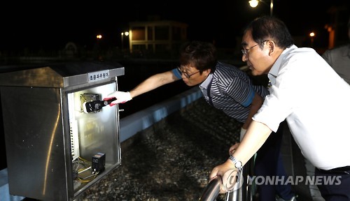 | △ 상수도관 점검하는 이승훈 청주시장 (청주=연합뉴스) 지난 3일 오후 10시께 청주시 상당구 지북정수장에서 이승훈 청주시장이 800㎜ 상수도관이 정상적으로 작동되는지를 직접 점검하고 있다. 2015.8.4 vodcast@yna.co.kr <<청주시 제공>> |