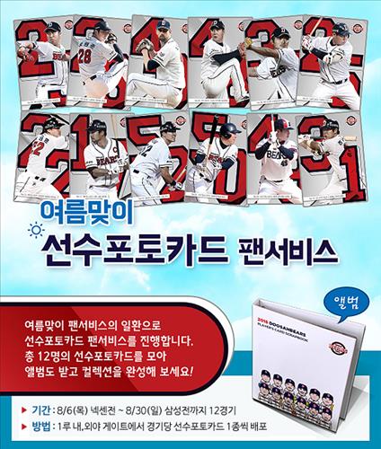 (서울=연합뉴스) 프로야구 두산 베어스는 6일 넥센 히어로즈전부터 30일 삼성 라이온즈전까지 8월 한 달간 서울 잠실구장에서 열리는 홈 경기에서 여름 맞이 선수 포토카드 팬서비스를 준비했다.