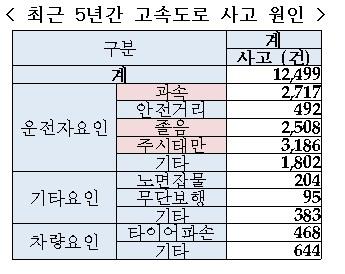 고속도로 사고 원인으로는 주시태만이 3천186건으로 가장 많았고, 과속 2천717건, 졸음 2천508건 순으로 집계됐다.