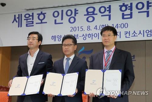 | △ (세종=연합뉴스) 이정훈 기자 = 연영진 세월호 인양추진단장(가운데)이 4일 오후 정부세종청사에서 열린 세월호 인양 용역 협약 조인식에서 홍총 상하이샐비지 대표(오른쪽), 윤종문 오션씨앤아이 대표와 협약서에 서명한 뒤 기념촬영을 하고 있다. 2015.8.4 uwg806@yna.co.kr (끝) |
