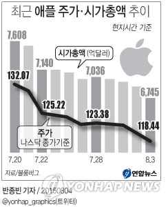 이 기간 애플의 시가총액은 7천608억 달러(약 890조9천억원)에서 6천576억 달러(768조7천억원)로 줄어들어 1천32억 달러, 한화로 약 103조원이 증발했다.