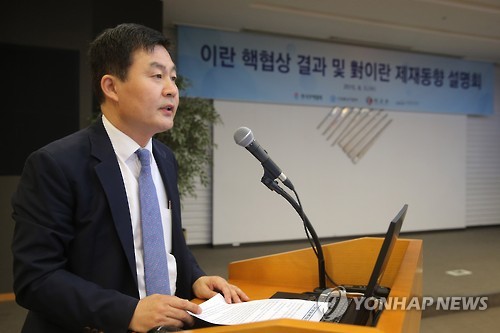| △ 정부, '대이란 제재 해제동향' 합동설명회 (서울=연합뉴스) 이정훈 기자 = 5일 오전 서울 강남구 삼성동 트레이드타워에서 외교부와 산업통상자원부 주최로 열린 '이란 핵협상 결과 및 대(對)이란 제재동향 설명회'에서 권희석 외교부 아중동국장이 모두 발언을 하고 있다. |