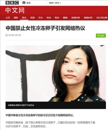 | △ 중국의 유명 여배우 쉬징레이가 미혼 여성이 난자를 얼리지 못하는 중국법을 공개적으로 비판하면서 관련법을 둘러싸고 논란이 벌어지고 있다고 영국 BBC방송 중문망이 보도했다. 사진은 BBC중문망 보도 캡쳐. 2015.8.5 (서울=연합뉴스) |