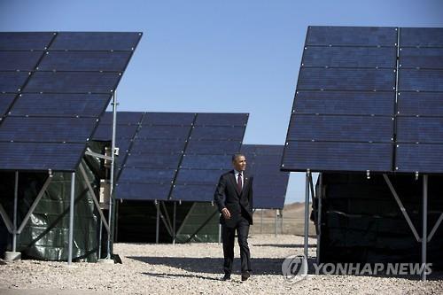 | △ 버락 오바마 미국 대통령이 지난 4월 유타주 공군기지의 태양광 패널 사이를 걸어가고 있다.(AP=연합뉴스) |