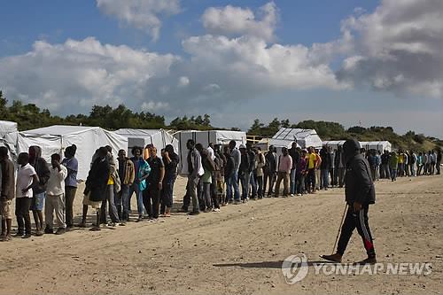 | △ (칼레<프랑스> AP=연합뉴스) 4일 프랑스 북부 항구도시 칼레에서 영국행을 요구하며 머물고 있는 난민들이 줄을 서서 한 자선단체의 급식을 기다리고 있다. ciy@yna.co.kr (끝) |