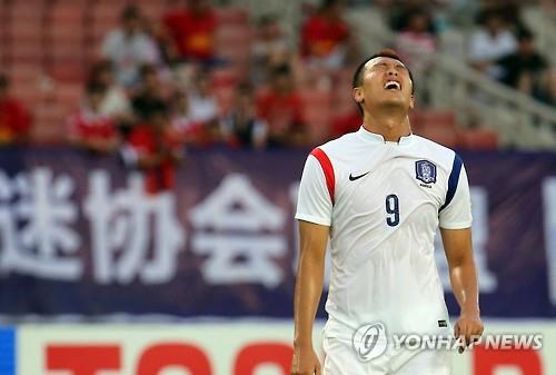 | △ (우한<중국>=연합뉴스) 최재구 기자 = 5일 중국 후베이성 우한스포츠센터에서 열린 동아시안컵 축구대회 한국과 일본의 경기에서 한국 김신욱이 본인의 슛이 빗나가자 아쉬워하고 있다. 2015.8.5 jjaeck9@yna.co.kr |