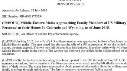 FBI는 "군인 가족들이 바로 자신의 집 앞에서 중동 남성들과 맞닥뜨리는 경우가 많이 보고되고 있다"면서 "이들 중동 남성은 협박을 통해 미군과 그 가족들에 대한 신상정보를 파악하려 하고 있고 해당 가족들은 위협을 느끼고 있다"고 말했다.