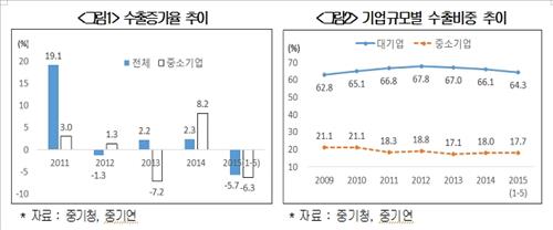 2011∼2014년 우리나라 중소기업의 수출증가율은 연평균 1.3%로, 같은 기간 우리나라 전체 수출 증가율 5.6%를 크게 밑돌았다. 올해는 5월(누적기준)까지 전년 같은 기간에 비해 6.3% 감소했다.