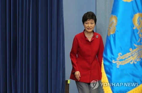 | △ 입장하는 박 대통령 (서울=연합뉴스) 이정훈 기자 = 박근혜 대통령이 6일 오전 청와대 춘추관 브리핑룸에서 대국민 담화를 발표하기 위해 입장하고 있다. |