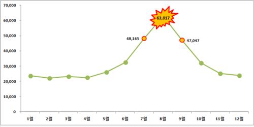 6월에 3만2천여명, 7월에는 4만8천여명이 농가진으로 병원을 찾는다. 8월에 정점을 찍은 환자 수는 9월 4만7천여명, 10월 3만2천여명 등으로 기온이 내려가면서 함께 줄어든다.