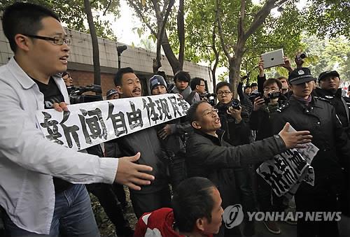 | △ 시진핑(習近平) 국가주석을 중심으로 한 중국 지도부의 검열 강화로 정권에 비판적인 지식인들, 특히 자유주의 성향의 학자들이 설 자리를 잃고 있다고 6일(현지시간) 영국 가디언이 보도했다. 사진은 시 주석 집권 초기인 지난 2013년 1월 광둥성의 진보 주간지 남방주말(南方周末) 사옥 밖에서 진보파 인사들이 언론자유와 검열철폐를 요구하는 시위를 벌이며 경찰과 대치하는 모습. 2015.8.7 (AP=연합뉴스DB) |
