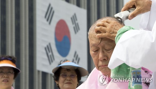 | △ 삭발식하는 희생자 유가족협동조합 회원 (서울=연합뉴스) 윤동진 기자 = 7일 오후 서울 광화문광장에서 열린 기자회견에서 일제강제동원 국외희생자 유가족협동조합 회원이 정부를 상대로 일제강제동원 국외희생자 보상법 통과를 촉구하며 삭발식을 하고 있다. |