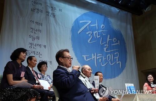 | △ '젊은 날의 대한민국' 출판기념 북콘서트 (서울=연합뉴스) 이지은 기자 = 9일 오후 서울 마포구 가톨릭청년회관에서 열린 '젊은 날의 대한민국' 출판기념 북콘서트에서 파독 광부·간호사, 한국과학기술연구원(KIST) 창립멤버 등이 토크 형식으로 청년들에게 전하고 싶은 메시지를 말하고 있다. 이 책은 14명의 대학생 집필단이 60~70년대 당시 청년들의 이야기를 인터뷰 형식으로 담아 엮었다. 2015.8.9 jieunlee@yna.co.kr |