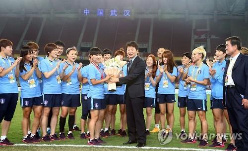 | △ 기념패 전달하는 정몽규 회장 (우한<중국>=연합뉴스) 최재구 기자 = 8일 중국 후베이성 우한 스포츠센터에서 열린 동아시안컵 여자축구대회에서 정몽규 대한축구협회장이 시상식을 마치고 A매치 100경기 출전을 기록한 권하늘 선수에게 기념패를 전달하고 있다. 2015.8.9 |