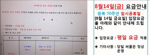 | △ 왼쪽은 14일 공휴일 요금을 적용하겠다고 공지한 골프장, 오른쪽은 평일 요금을 적용하겠다고 공지한 골프장. |