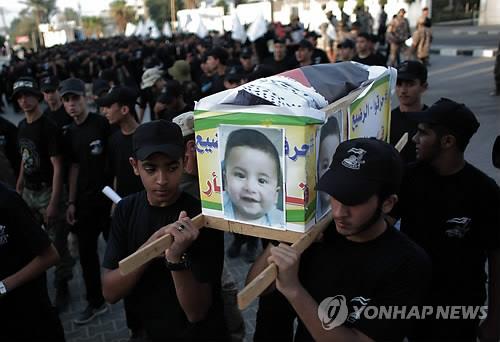 앞서 지난달 31일 오전 4시께 서안 북부 나블루스 인근 두마 마을의 팔레스타인 가족이 사는 집에 극우 이스라엘인들의 소행으로 추정되는 방화로 불이 났다.