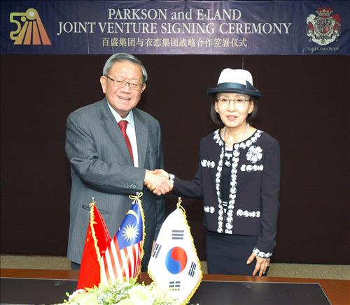 | △ 백성그룹 중팅썬(鍾廷森)회장과 이랜드그룹 박성경 부회장이 8월 6일 백성그룹 본사가 있는 말레이시아 쿠알라룸프르에서 합작사 설립에 합의했다. |