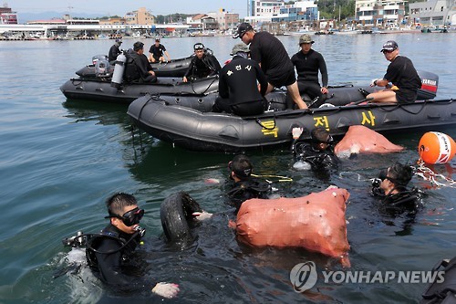 (강릉=연합뉴스) 유형재 기자 = 막바지 피서가 한창인 가운데 특수전교육단(이하 특교단) 해상척후조 교육생들이 9일 휴일도 반납한 채 강릉시 사천면 사천항 일원에서 수중정화활동을 벌였다.