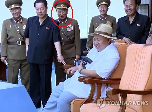 | △ '천안함 배후' 북한 김영철 '대장' 승진 (서울=연합뉴스) 천안함 폭침을 주도한 배후로 알려져 온 북한 김영철 정찰총국장(빨간 원)의 계급이 상장에서 대장으로 다시 올라간 것이 11일 북한 매체를 통해 확인됐다. 북한 조선중앙TV에서 이달 1일부터 방영 중인 김정은 국방위원회 제1위원장의 전투비행술경기대회 현지 지도 기록영화를 보면, 김영철 총국장의 군복 견장에 '대장'에 해당하는 '별 네개'가 달려 있는 것이 보인다. 앞서 지난 4월 국가정보원은 김영철의 계급이 기존의 대장에서 상장으로 강등됐다고 밝힌 바 있는데, 그가 대장 계급에 복귀한 것이 이번에 확인된 것이다. 2015.8.11 nkphoto@yna.co.kr |