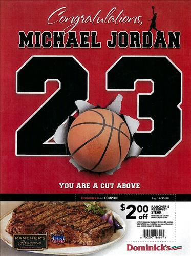 다미닉스는 지난 2009년 조던이 미 프로농구(NBA) 명예의 전당에 헌액된 소식이 전해진 후 유명 스포츠 전문지 '스포츠 일러스트레이티드'(SI)에 전면 축하 광고를 냈다. 광고에는 시카고 불스 유니폼 색상을 배경으로 조던의 이름과 등번호가 새겨져 있고 "당신은 한 수 위"(You are a cut above)라는 문구 아래 스테이크용 포장육 2달러 할인 쿠폰이 인쇄돼 있다.