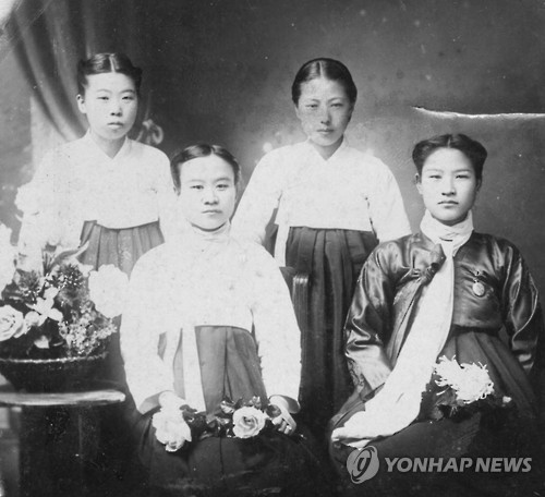 | △ 여성 독립운동단체 '송죽비밀결사대' (서울=연합뉴스) 평양 숭의여학교를 중심으로 1913년 조직된 송죽비밀결사대. 앞줄 왼쪽부터 송죽비밀결사대이자 숭의여학교 교사인 김경희, 김신희 지사. 여성가족부와 광복 70년 기념사업추진위원회는 오는 12∼23일 서울 종로구 대한민국역사박물관에서 '독립을 향한 여성 영웅들의 행진'을 주제로 특별기획전을 개최한다. (여성가족부 제공) |