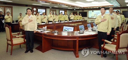 | △ 경기도 을지연습 준비보고회의 (수원=연합뉴스) 11일 오전 경기도청 상황실에서 열린 '2015 을지연습 준비보고 회의'에 참석한 남경필 경기도지사와 참석자들이 국기에 대한 경례를 하고 있다. 2015.8.11 <<경기도 제공>> hedgehog@yna.co.kr |