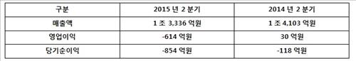 작년 2분기 대비 매출액은 5.4% 줄었고, 같은 기간 30억원의 영업이익이 614억원의 영업손실로 바뀌어 적자 전환했다.