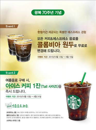 (서울=연합뉴스) 오예진 기자 = 스타벅스는 광복 70주년을 기념해 오는 13∼31일 여름 음료 1잔을 사면 아이스커피(톨 사이즈) 1잔을 무료로 주는 행사를 한다고 11일 밝혔다.