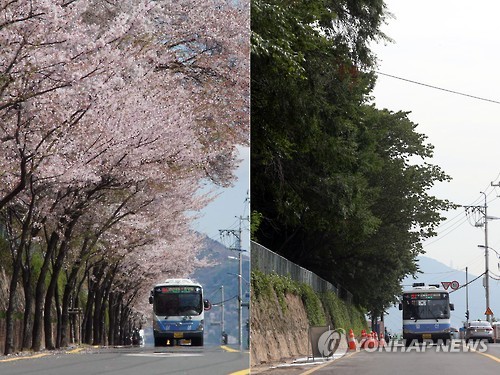 | △ 친환경주차장 공사에 싹둑 잘린 산복도로 벚꽃길 (부산=연합뉴스) 김선호 기자 = 부산 동구가 초량동 산복도로에 전망대를 갖춘 '친환경 스카이웨이 주차장' 공사를 하면서 수령 20년 이상의 벚나무 40여 그루를 잘랐다. 왼쪽 사진은 공사 전 벚꽃이 만개한 도로이며 오른쪽 사진은 공사 후 벚나무가 잘려나간 도로 사진이다. (좌측 동구 주민 제공) |
