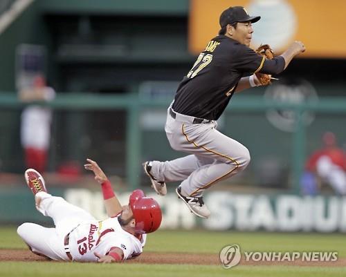 | △ (세인트루이스 AP=연합뉴스) 피츠버그 파이리츠 한국인 내야수 강정호(오른쪽)가 12일(한국시간) 미국 미주리주 세인트루이스 부시 스타디움에서 열린 세인트루이스 카디널스와 메이저리그 방문 경기에 선발 출전해 유격수 수비를 소화하고 있다. 이날 강정호는 규정타석을 채웠다. |