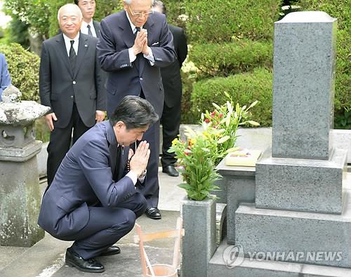 | △ (교도=연합뉴스.자료사진)아베 신조(安倍晋三) 일본 총리가 작년 8월 12일 자신의 지역구가 있는 야마구치(山口)현에 위치한 외조부 기시 노부스케(岸信介·1896∼1987) 전 총리의 묘 앞에서 두 손을 모으고 있는 모습. |