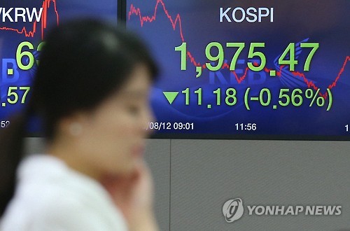 | △ 위안화 '쇼크'에 코스피 1,970선 추락 (서울=연합뉴스) 김도훈 기자 = 중국 위안화의 추가 평가절하로 코스피가 하락한 12일 오후 서울 중구 외환은행 본점 딜링룸에서 한 직원이 종가가 뜬 스크린 앞을 지나고 있다. 이날 코스피는 전날보다 11.18포인트(0.53%) 하락한 1,975.47로 마감해 5거래일째 약세를 이어갔다. |
