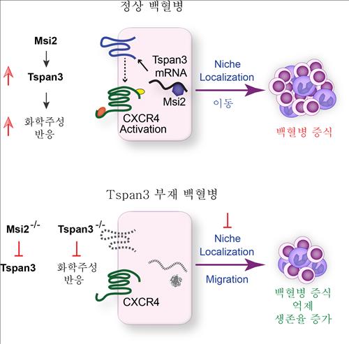 (서울=연합뉴스) 정성호 기자 = 백혈병 환자의 암세포가 자라는 데 영향을 주는 '티스팬3'(Tspan3)이란 단백질의 역할을 국내 연구진이 밝혀냈다. 암세포의 신호전달 경로가 새롭게 규명됨에 따라 백혈병 치료에 새 발판이 마련될 전망이다.