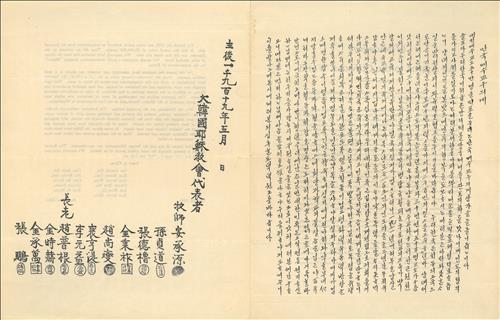 1919년 5월 작성된 것으로 명기된 이 호소문은 "대한예수교도 50만명을 대표해 우리는 만국 예수교우에게 삼가 글을 올리옵나이다"라는 문장으로 시작한다.