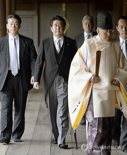 | △ 취임 1주년을 맞이한 2013년 12월 26일 야스쿠니신사를 참배차 방문한 아베 신조(安倍晋三) 일본 총리.(교도=연합뉴스 자료사진) |