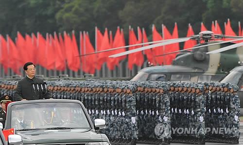 | △ 후진타오 전 중국 국가주석이 홍콩 섹콩의 인민해방군 군영에서 홍콩주권반환 기념 인민해방군 사열을 하고 있다. (EPA=연합뉴스) |