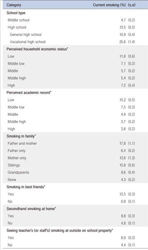 이밖에도 청소년 흡연율은 일반계 고등학교보다 특성화계 고등학교에서, 가정의 경제 수준과 본인의 학업 수준이 낮을수록 높았다.