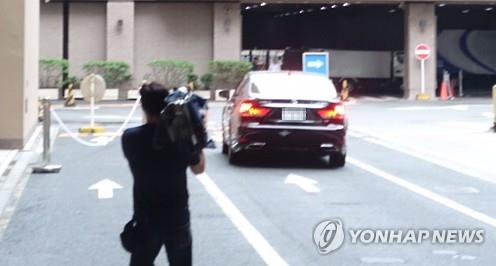 | △ 17일 오전 신동빈 롯데그룹 회장을 태운 승용차가 일본 롯데홀딩스 임시주주총회가 열린 일본 도쿄 데이코쿠호텔을 빠져나가고 있다. |