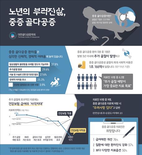 학회 정윤석 회장은 "이번 조사를 통해 우리나라 의료환경이 중증 골다공증을 효과적으로 치료하는 데 부족한 점이 있다는 게 확인됐다"면서 "중증 골다공증에 효과가 입증된 치료옵션에 건강보험 급여가 적용된다면 환자들의 빠른 회복과 추가 골절 예방으로 사회적 비용을 절감할 수 있을 것"이라고 말했다.