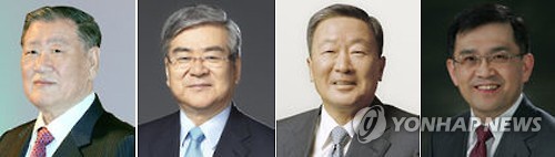 | △ 정몽구 42억ㆍ조양호 39억 상반기 기업인 보수 공시 (서울=연합뉴스) 17일 금융감독원 전자공시에 따르면 올해 상반기 정몽구 회장(왼쪽부터)의 등기임원 보수는 현대차 24억원, 현대모비스 18억원 등 총 42억원으로 집계됐다. 조양호 한진그룹 회장은 대한항공 등 3개 계열사로부터 올해 상반기 38억8천846만원을, 구본무 LG 회장은 상반기 34억3천만원의 연봉을 수령했다. 또 삼성전자의 권오현 대표이사 부회장은 올해 상반기 29억5천만원의 보수를 받았다. |