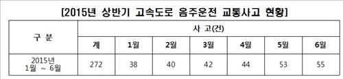 (서울=연합뉴스) 성혜미 기자 = 올해 상반기 전국 고속도로에서 음주운전으로 2천400여명이 적발되고 272건의 교통사고가 발행한 것으로 나타났다.