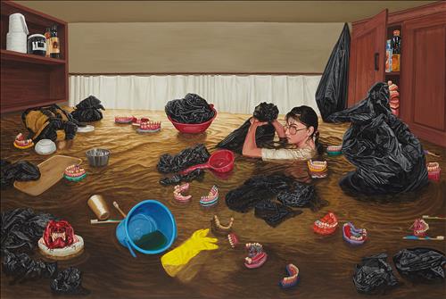 (서울=연합뉴스) 김정선 기자 = 실내 공간에서 머리를 묶은 한 여성이 비닐봉지를 움켜쥐고 어깨 위까지 차오른 알 수 없는 액체 위에 있다.