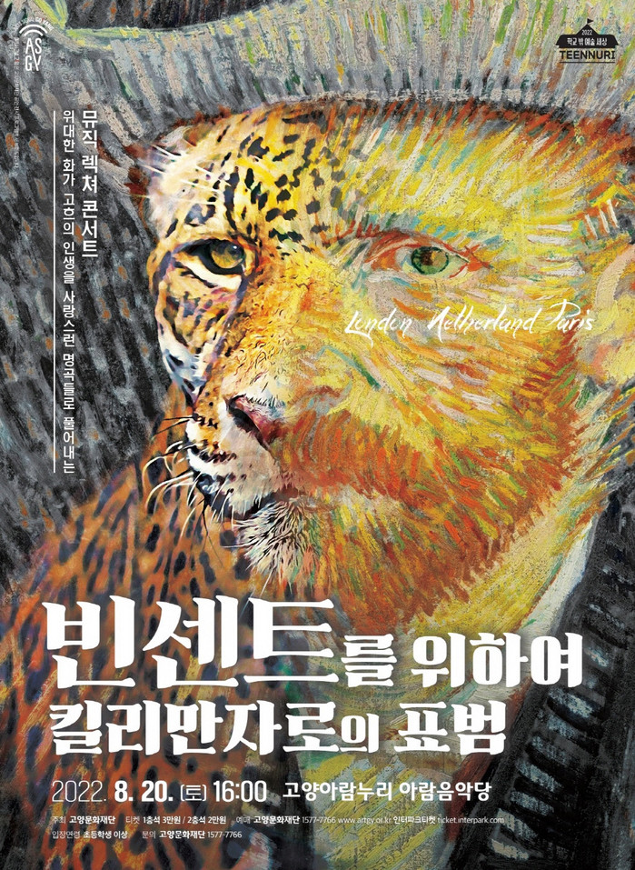 [부자동네타임즈 김인수기자] 고양문화재단(대표이사 정재왈)은 반 고흐의 예술적 생애를 주제로 한 <빈센트를 위하여_킬리만자로의 표범>을 오는 8월 20일 오후 4시, 고양아람누리 아람음악당에서 개최한다. 코로나19로 지친 청소년 및 일반인을 위해 미술과 음악을 동시에 아우르는 문화융합공연으로 해설자의 친절한 설명을 더해진 무대이다.