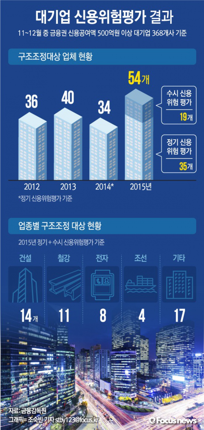 한편, 감독당국은 C등급의 경우 신속한 금융지원과 자산 매각 및 재무구조개선 등을 통해 정상화를 추진하고 D등급에 대해서는 기업회생절차 등을 통해 신속한 정리를 유도할 계획이다.(서울=포커스뉴스) 30일 금융감독원은 지난 7월 진행된 ‘상반기 정기신용평가’와 ‘2015년 대기업 수시 신용위험평가’의 결과까지 합하면, 올해 구조조정 대상으로 선정된 업체 수는 54개로 2012년 이후 최대치라고 밝혔다. 2015.12.30 조숙빈 기자