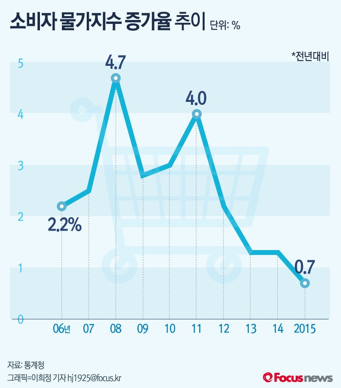 (서울=포커스뉴스) 올해 연간 물가상승률이 역대 최저치로 떨어져, 본격적인 디플레이션(저성장·저물가) 시대에 접어든 것이 아니냐는 우려가 나오고 있다. 저유가 현상 완화 등으로 내년엔 올해보다 나아질 것으로 예상되지만, 내수를 끌어올릴만한 소득 상승 등 본질적인 대책이 없는 한 이같은 우려는 지속될 것으로 보인다.