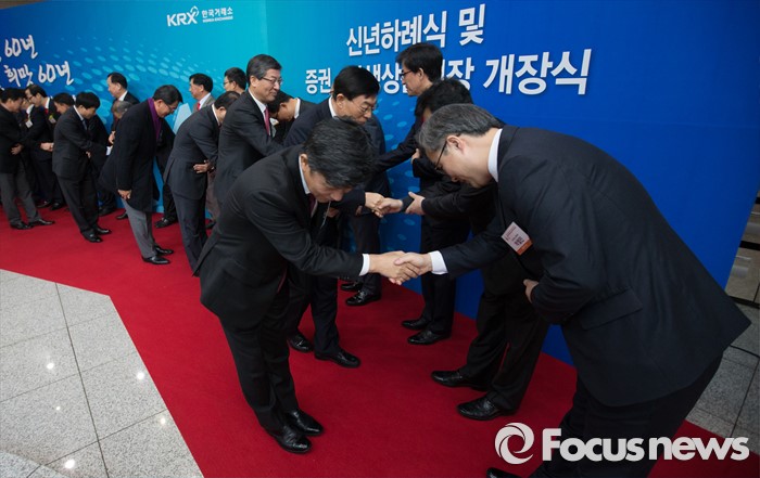 (서울=포커스뉴스) 병신년(丙申年) 새해 첫 증시 개장일인 4일 오전 영등포구 서울 여의도 거래소에서 2016년도 증권·파생상품시장 60주년 개장식 및 신년 하례식에서 내, 외빈들이 인사를 나누고 있다.