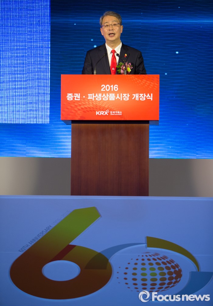 (서울=포커스뉴스) 병신년(丙申年) 새해 첫 증시 개장일인 4일 오전 영등포구 서울 여의도 거래소 2016년도 증권·파생상품시장 60주년 개장식에서 임종룡 금융위원장이 축사를 하고 있다.
