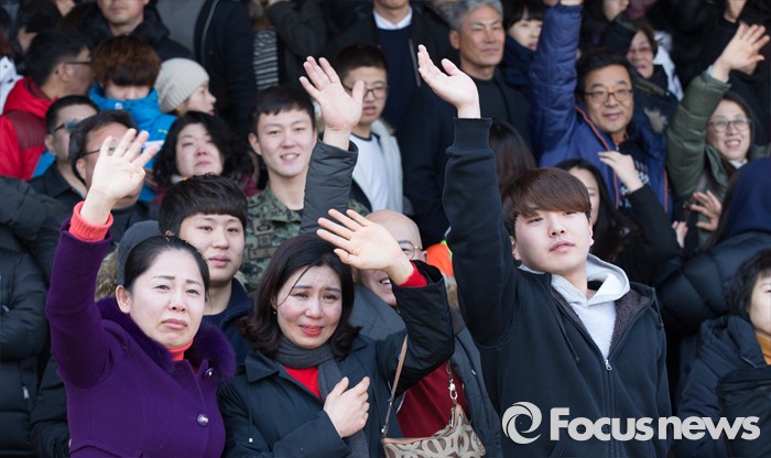 (논산=포커스뉴스) 4일 오후 충남 논산 육군훈련소 입영심사대에서 입영장병의 가족들이 손 인사를 하고 있다.