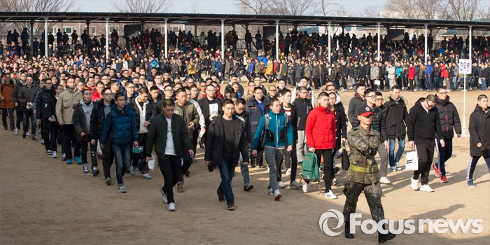(논산=포커스뉴스) 4일 오후 충남 논산 육군훈련소 입영심사대에서 입영장병들이 가족과 인사하기 위해 연병장을 돌고 있다.
