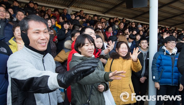 (논산=포커스뉴스) 4일 오후 충남 논산 육군훈련소 입영심사대에서 가족들이 손인사를 하고 있다.